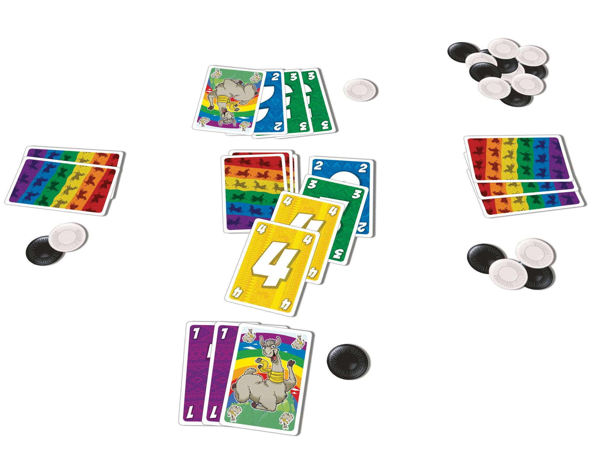 The round ends when one player empties their hand or all players have quit. In either case, players collect tokens based on the cards in their hand. Each different number card in hand gets you white tokens (each worth 1 point) equal to the value of the card while one or more llamas gets you a black token (worth 10 points). (You can exchange ten white tokens for one black token at any time.) If you played all your cards, you can return one token (white or black) that you previously collected to the supply. You then shuffle all the cards and begin a new round, in which the first player to play will be the one who emptied their hand or was the last one to quit in the previous round.