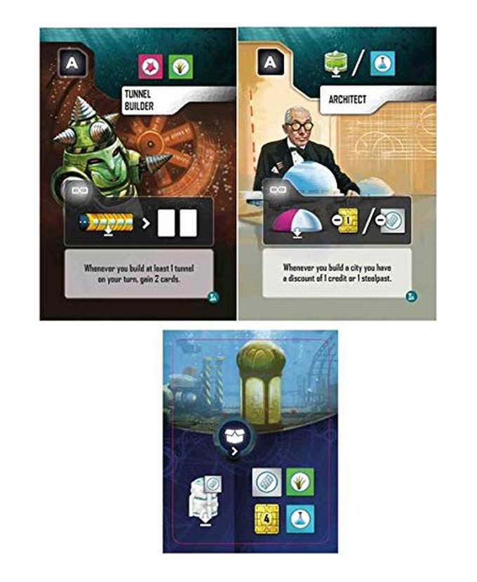 In Underwater Cities, which takes about 30-45 minutes per player, players represent the most powerful brains in the world, brains nominated due to the overpopulation of Earth to establish the best and most livable underwater areas possible.