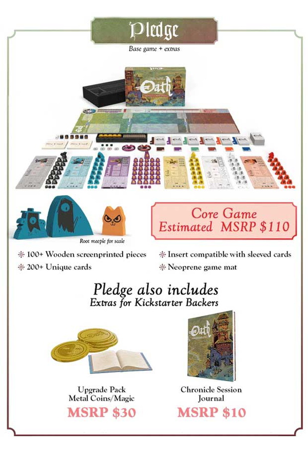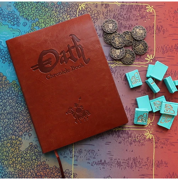 In Oath, one to six players guide the course of history in an ancient land. Players might take the role of agents bolstering the old order or scheme to bring the kingdom to ruin. The consequences of one game will ripple through those that follow, changing what resources and actions future players may have at their disposal and even altering the game's core victory condition.