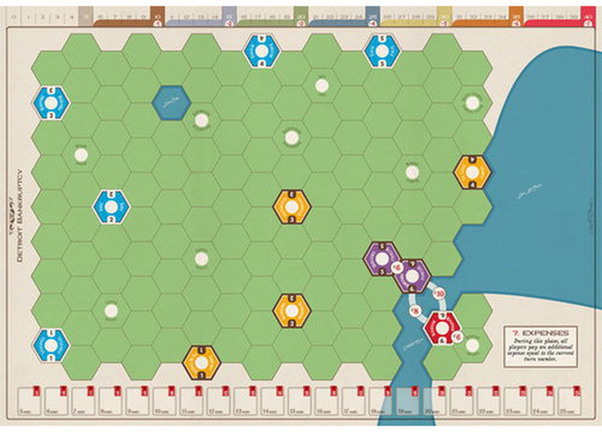 Detroit Bankruptcy by Chad DeShon -- The economic collapse in the mid-2000s was felt especially hard in Detroit. Bankruptcies and government bailouts popped up everywhere. Even the city itself declared bankruptcy. This expansion map shifts that economic stress into full throttle right from turn one. There will be bankruptcies. Staying solvent is all that matters. The last player still solvent wins. A new solo mode will be included in the rules for this map - making it a 1-5 player map.