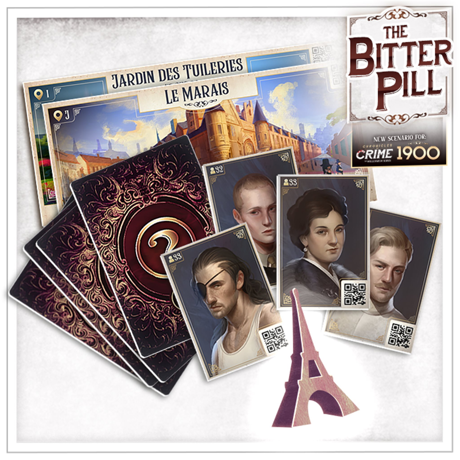 New 1900 components: 4 Character cards, 2 Location boards, an Eiffel Tower meeple, 4 Puzzle cards.