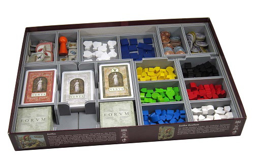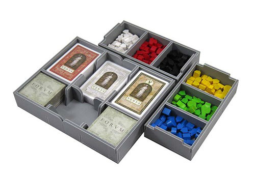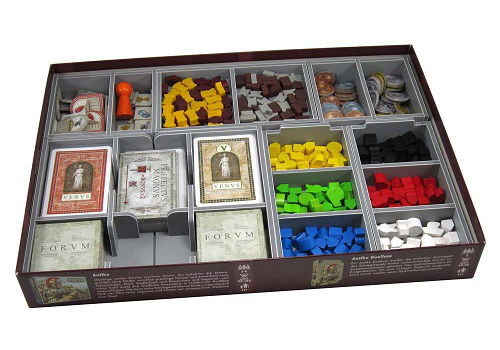 The board and rules act as a lid on top of the insert trays. Once fully loaded the box can be stored vertically and the lid closes flush. First place the player boards on top of the player piece trays. Next goes the board. Note that in the base game box there is room for only one board, the other boards form your collection should be stored in one of the expansion boxes. On top of the board go the Venus and forum boards, followed by the rules.