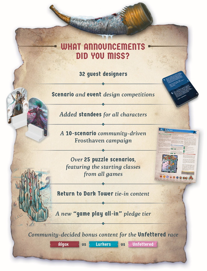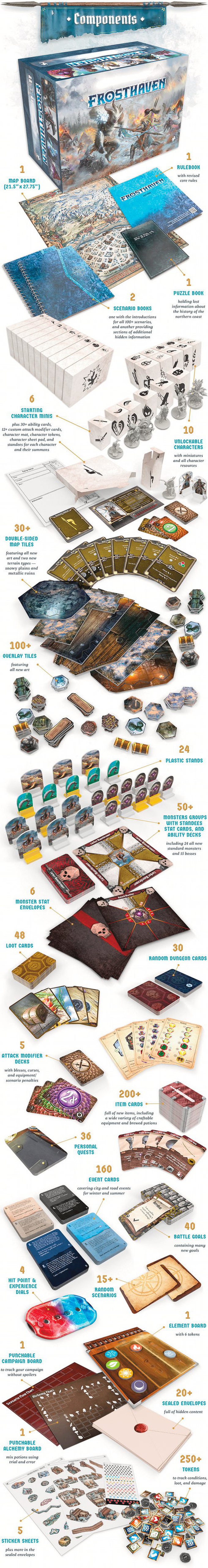 Frosthaven is a standalone adventure from the designer and publisher of Gloomhaven that features sixteen new characters, three new races, more than twenty new enemies, more than one hundred new items, and a new, 100-scenario campaign.
