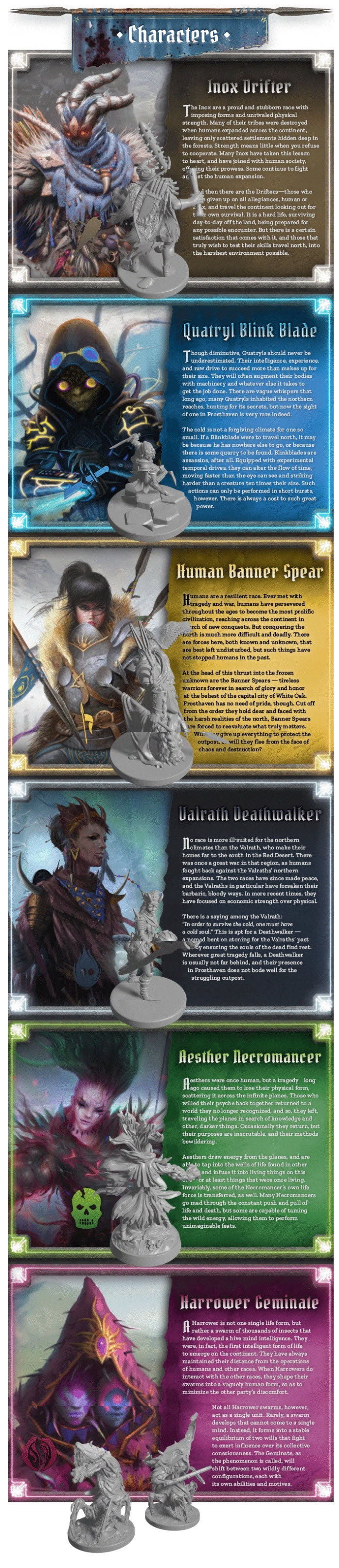 Frosthaven is the story of a small outpost far to the north of the capital city of White Oak, an outpost barely surviving the harsh weather as well as invasions from forces both known and unknown. There, a group of mercenaries at the end of their rope will help bring back this settlement from the edge of destruction.