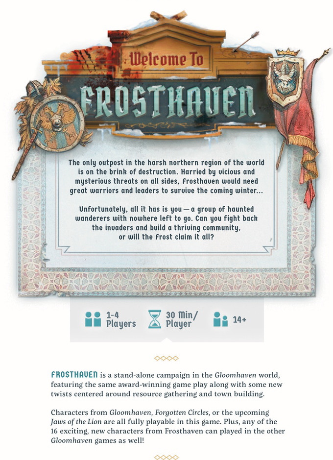 Frosthaven is the story of a small outpost far to the north of the capital city of White Oak, an outpost barely surviving the harsh weather as well as invasions from forces both known and unknown. There, a group of mercenaries at the end of their rope will help bring back this settlement from the edge of destruction. Frosthaven is a standalone adventure from the designer and publisher of Gloomhaven that features sixteen new characters, three new races, more than twenty new enemies, more than one hundred new items, and a new, 100-scenario campaign.