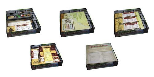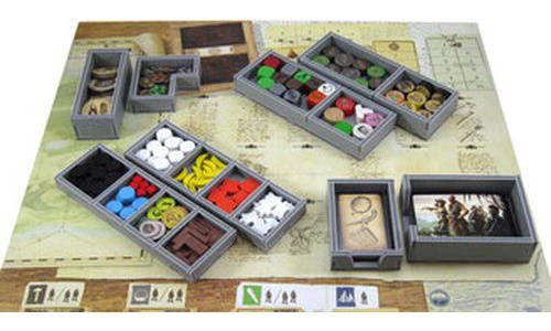 Insert compatible with Robinson Crusoe® and the Voyage of the Beagle Vol. 1 ® expansion. The design provides both efficient storage and improved game play. The trays can be utilised during the game to organize the components and make easy access by all players, and they greatly aid set-up and clear-away times. The rules and boards act as a lid on top of the trays. The insert is arranged in two layers as shown.