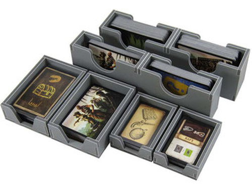 These are the card trays. There are two bottom-less trays for storing large cards vertically down the sides of the box. . There are two more card trays for the remaining large cards, and two separate trays for the small cards. All trays are sized to fit sleeved cards.