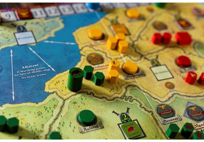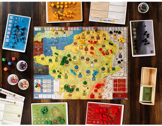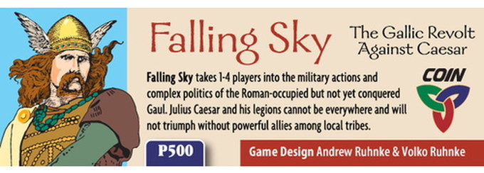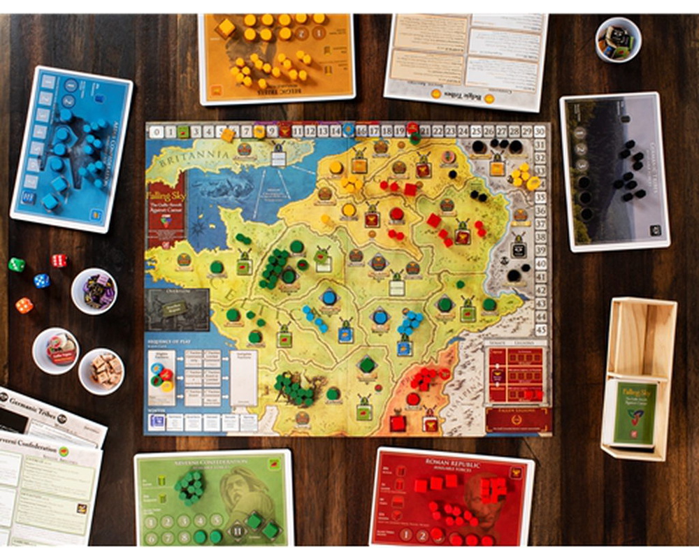 Falling Sky: The Gallic Revolt Against Caesar, formerly Gallic War, takes 1 to 4 players into the military actions and complex politics of Roman-occupied but not-yet-conquered Gaul. Caesar and his hard-hitting legions cannot be everywhere and will not triumph without powerful allies among local tribes. But each Gallic confederation has its own agenda and must keep its eyes not only on the Romans but also on Celtic, Belgic, and Germanic rivals. Players recruit forces, rally allies, husband resources for war, and balance dispersed action with the effectiveness and risk of concentrated battle.