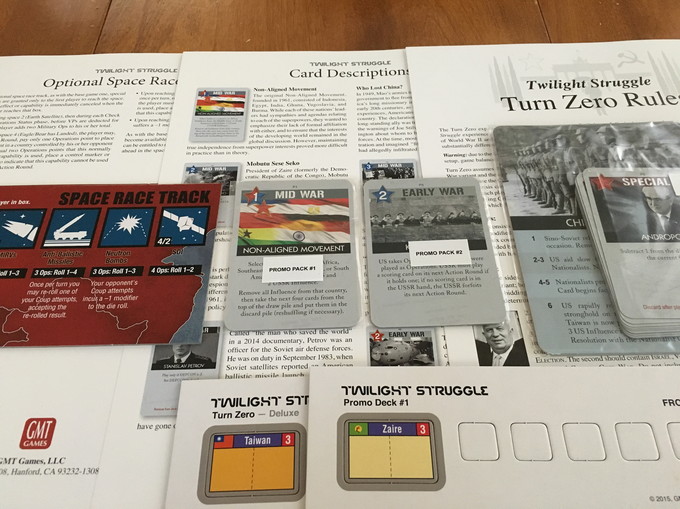 Each of the two Promo Packs includes four new cards for the game, some including "What if" alternate history additions to the game. The Turn Zero expansion adds twelve new cards and a new starting point for Twilight Struggle. Also included in the expansion pack are rules for a new Optional Space Race Track, to add variability to your Twilight Struggle experience.