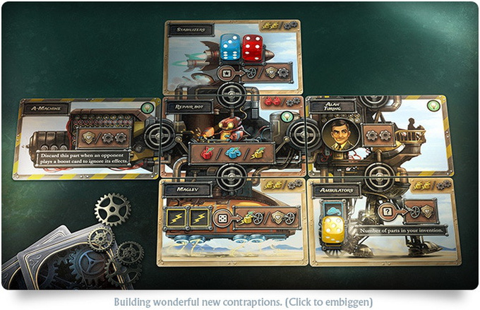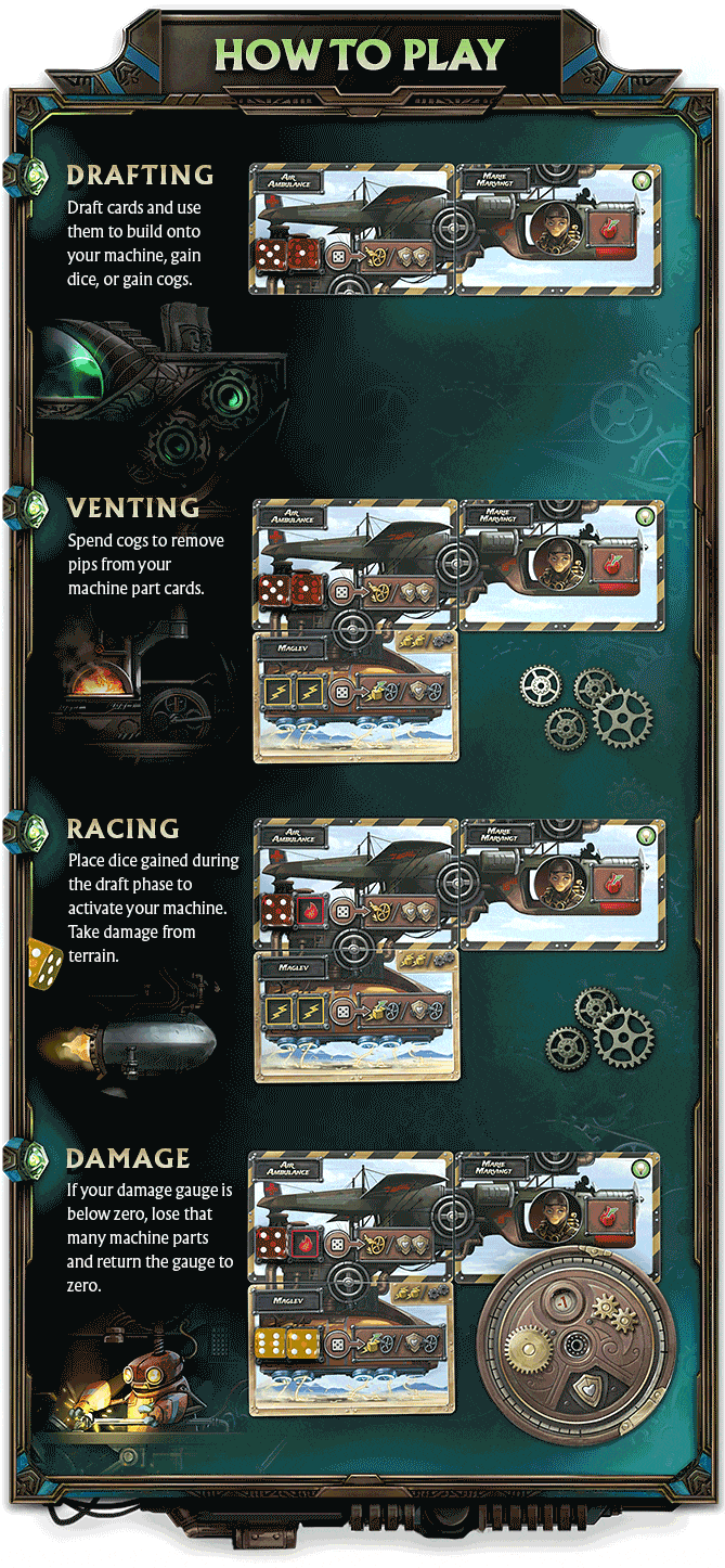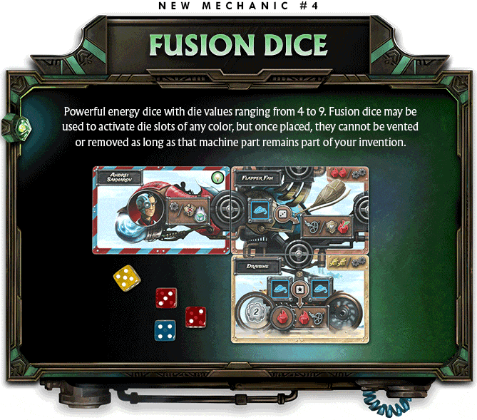 Take on the role of ingenious inventors from history. Draft cards to invent your racing contraption. Power your creation's abilities with combinations of steam, heat, electricity, and Fusion dice. Use cogs to augment bad dice rolls and upgrade certain machine parts.
