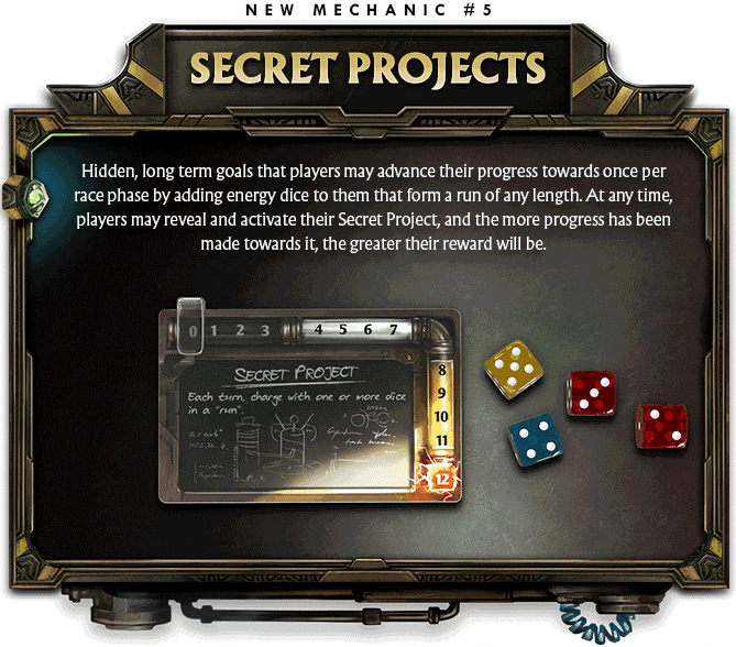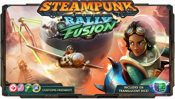 Steampunk Rally Fusion is a standalone game that can be combined with the original Steampunk Rally. It introduces new tracks with unique event cards, new part abilities (Gear Up and Overcharge), and a new card type: Secret Projects. It also debuts new custom dice representing powerful Fusion energy!