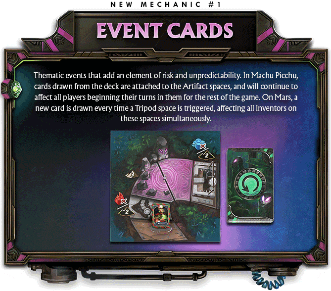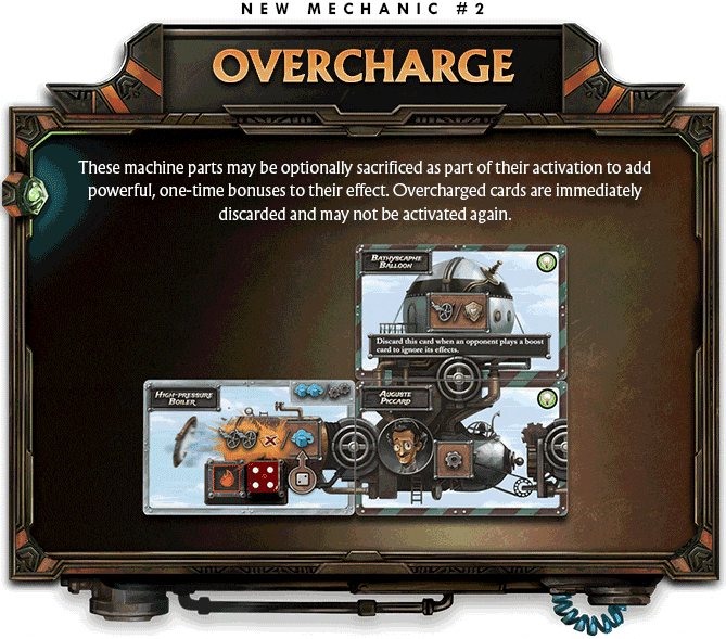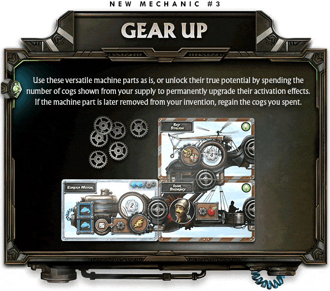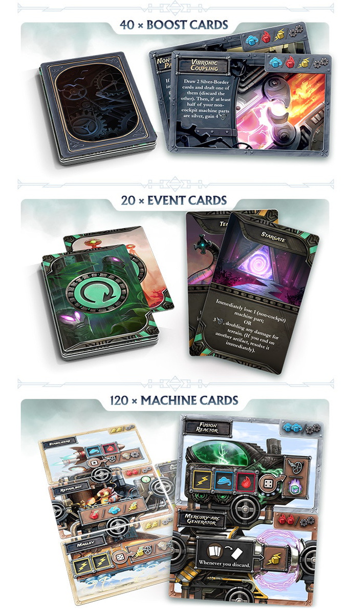 Smashing through damaging terrain spaces may cause parts to fly off your machine, constantly forcing you to adapt your strategy and discover new card synergies. Fortune favors the brash, so get ready to Gear Up, Overcharge your machine, and remake history!