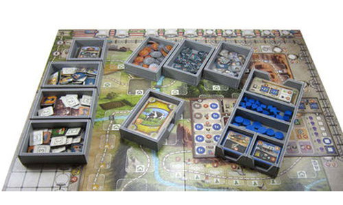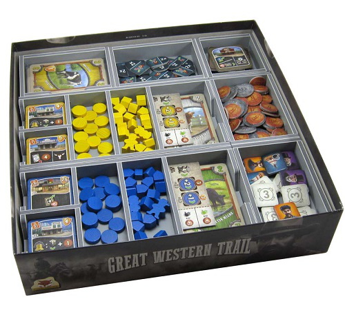 Insert compatible with Great Western Trail®, and includes space for the Rails to the North® Expansion. The design provides both efficient storage and improved game play. The trays can be utilised during the game, and they greatly aid set-up and clear-away times. The rules act as a lid on top of the trays. Check out other organizers and inserts in the Folded Space series.