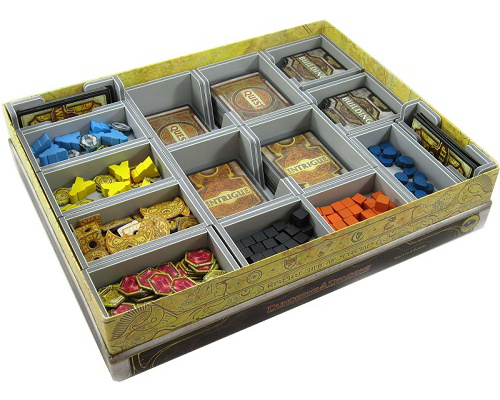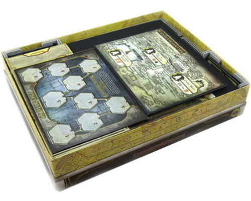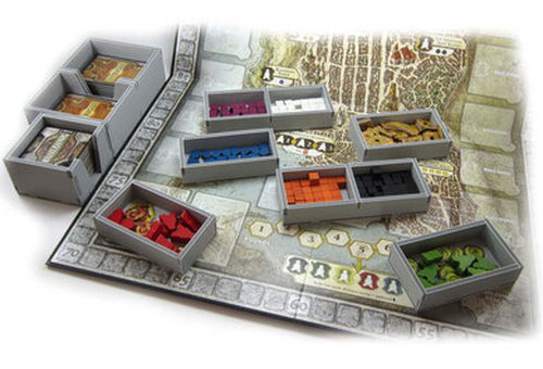 Insert compatible with Lords of Waterdeep®, and Scoundrels of Skullport® expansion. The design provides both efficient storage and improved game play. The trays can be utilised during the game, and they greatly aid set-up and clear-away times. The rules and boards act as a lid on top of the trays.