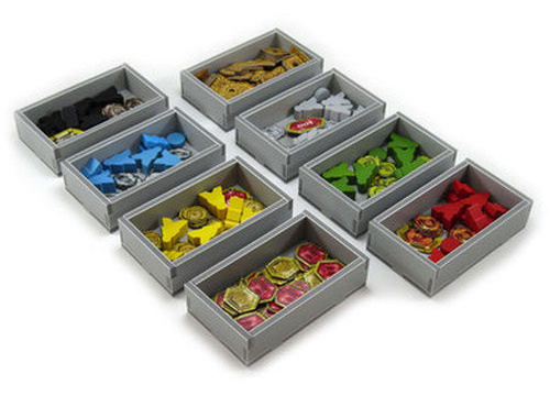 There are six trays for each player pieces. Two more similarly sized trays are for storing the coins and gem tiles.