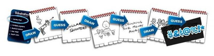 "Each player begins by sketching a TELESTRATIONS word dictated by the roll of a die. The old fashioned sand timer may limit the amount of time they get to execute their sketch, but it certainly doesn't limit creativity! Time's up! All players, all at the same time, pass their sketch to the next player, who must guess what's been drawn. Players then simultaneously pass their guess -- which hopefully matches the original word (or does it??) -- to the next player who must try to draw the word they see -- and so on."