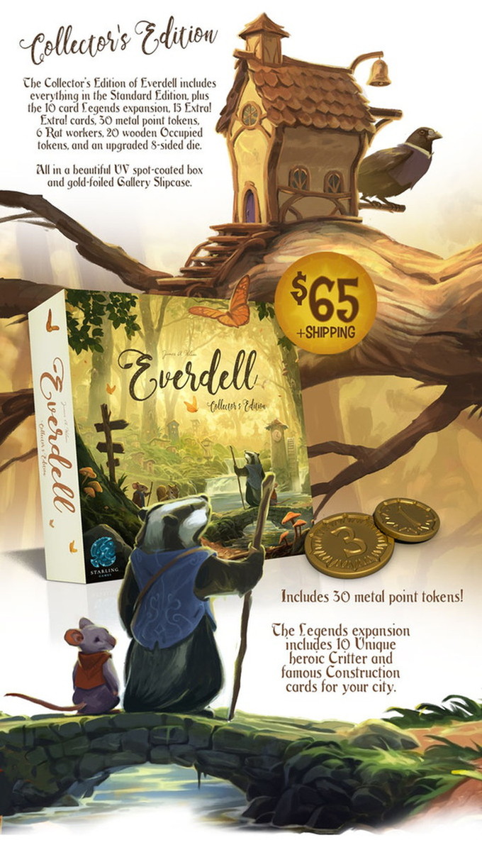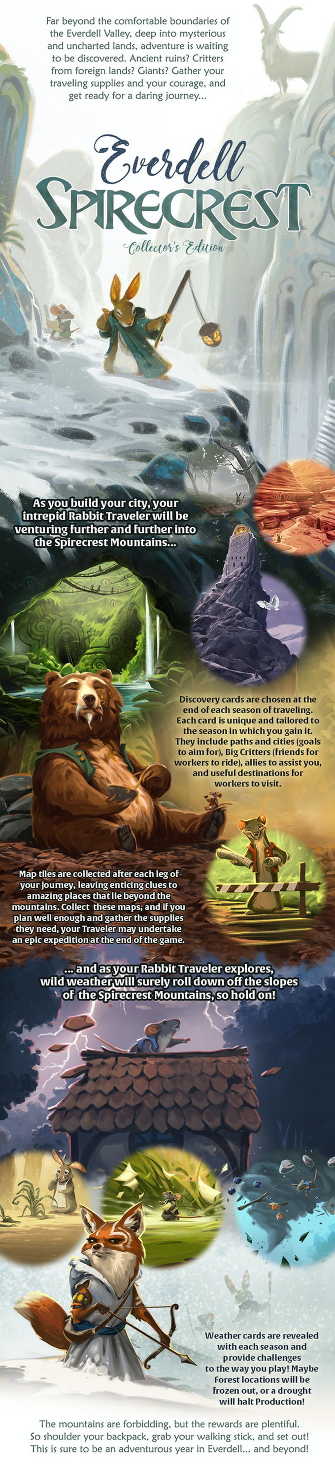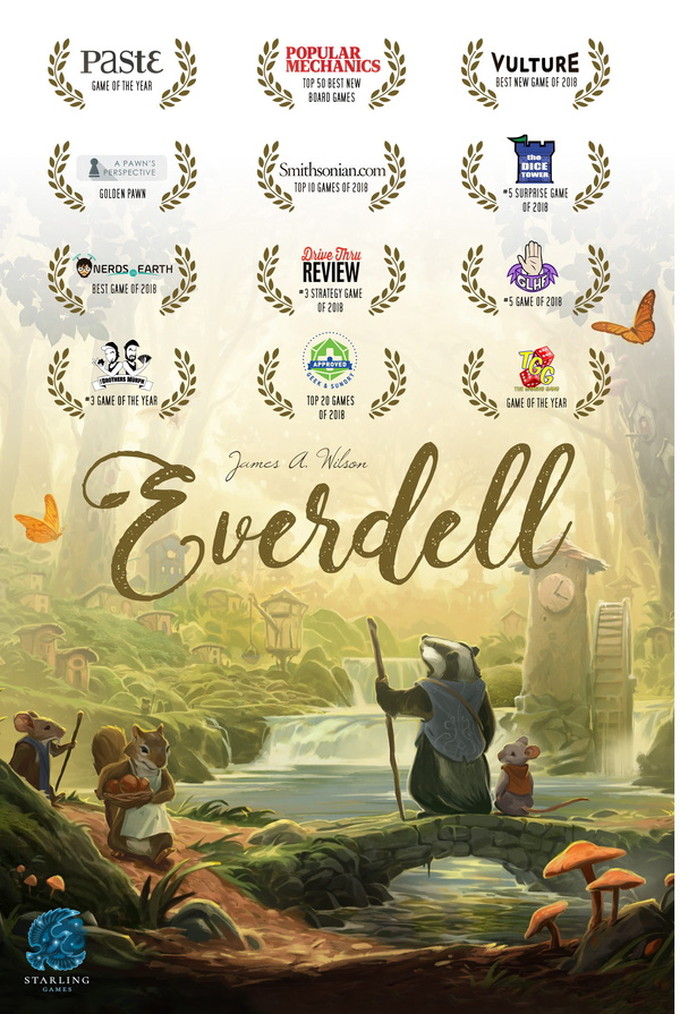 Within the charming valley of Everdell, beneath the boughs of towering trees, among meandering streams and mossy hollows, a civilization of forest critters is thriving and expanding. From Everfrost to Bellsong, many a year have come and gone, but the time has come for new territories to be settled and new cities established. You will be the leader of a group of critters intent on just such a task. There are buildings to construct, lively characters to meet, events to host—you have a busy year ahead of yourself. Will the sun shine brightest on your city before the winter moon rises?