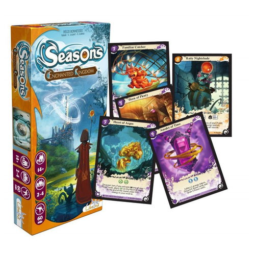 (XP1) Seasons: Enchanted Kingdom, the first expansion for Seasons, includes two copies each of 20 new power cards, 10 enchantment cards, 12 special ability tokens that fit into the hole on a player board – so that wasn't just kooky graphic design, but rather foreshadowing! – and additional other material, such as two replacement cards that have received errata in newer editions of Seasons.