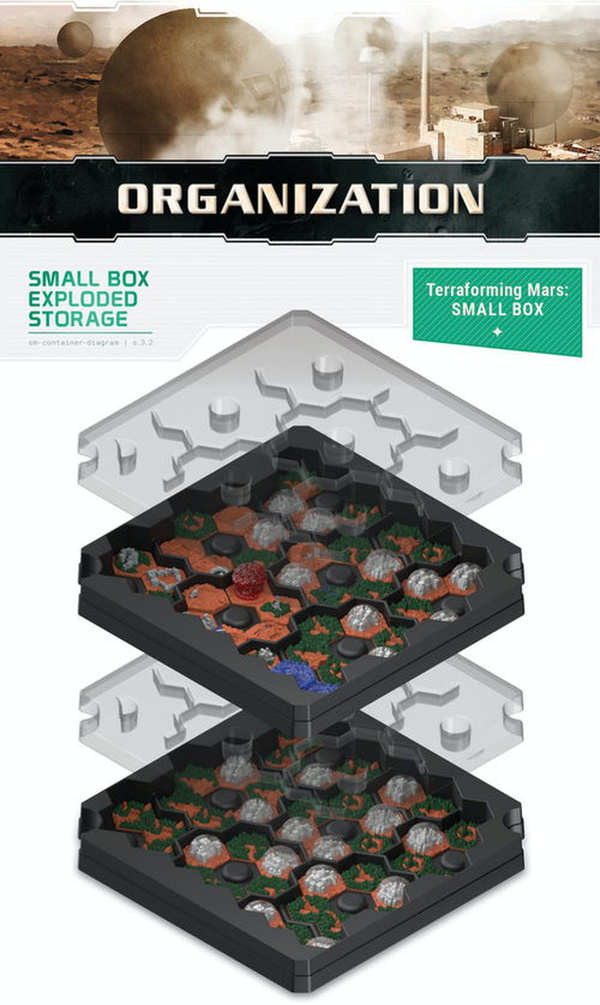 Terraforming Mars: Small Box is a set of 3D terrain tiles to dress up the game and a storage option for these add-ons (the small box will not hold any Terraforming Mars base and expansion components). Included in the box are:
