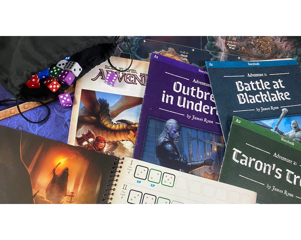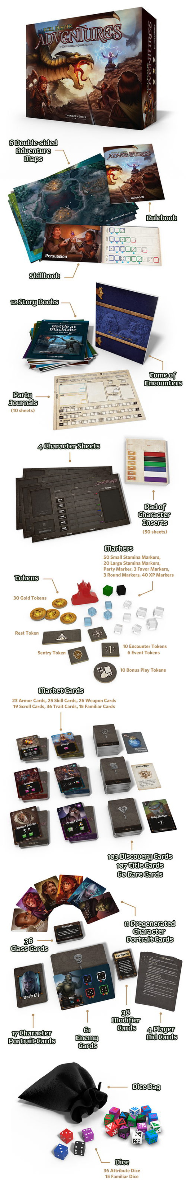 Roll Player Adventures is a cooperative storybook board game for 1-4 players set in the world of Roll Player. Players inhabit characters, face challenges, and make decisions that will change the story as they progress through 11 core Adventures and a replayable Side Quest.
