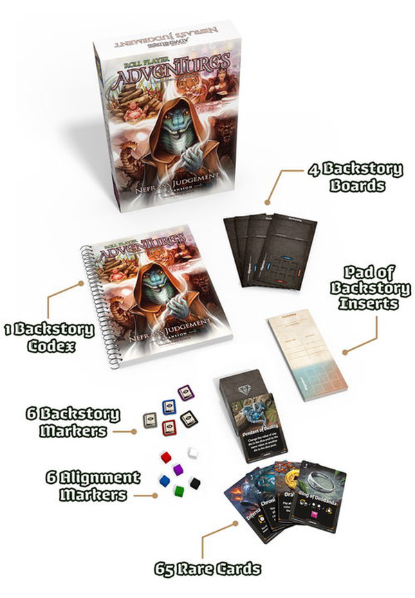 If you are importing a character from Roll Player to your Roll Player Adventures campaign, this expansion will add in new elements related to your backstory and alignment. Nefras's Judgement can also be used with any of the pregenerated characters included in Roll Player Adventures, each of which will have a unique backstory.
