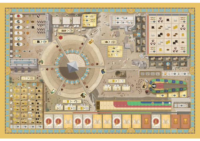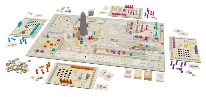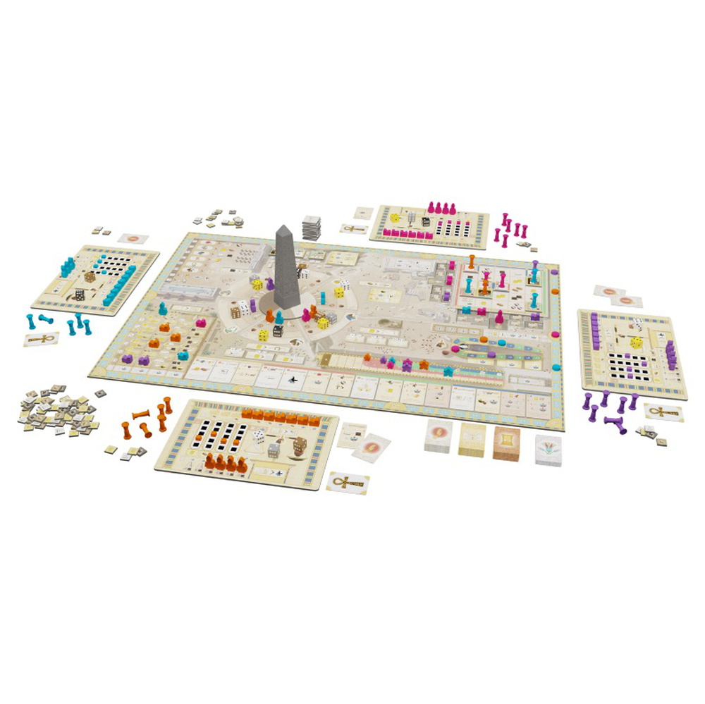 The game board in Tekhenu: Obelisk of the Sun is divided into six sections, each associated with an Egyptian god: Horus, Ra, Hathor, Bastet, Thoth, and Osiris. In the center stands an impressive obelisk (Tekhenu) that casts its shadow onto different parts of the board. As a result, the area around the obelisk is divided into sunny, shaded, and dark sections, depending on how the obelisk casts its shadow at that particular moment. As the game progresses, the sun's rotation alters which sections are sunny, shaded, or dark.