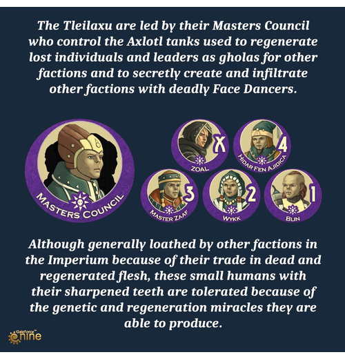 Tleilaxu: Led by a small council of Tleilaxu Masters - the fanatic, xenophobic Tleilaxu were tolerated because of their useful genetic engineering superiority. Although underestimated and loathed by others, they hoped to someday dominate all.
