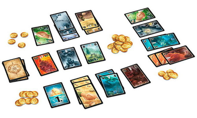 The card deck consists of (in each of the five colors) three wager cards, two copies of cards numbered 2-5, and one copy of cards numbered 6-10; shuffle this deck, then divide it into four piles, keeping only one pile in front of players for now. From a separate deck, each player is given two differently colored wager cards at the start of play. A bank of 36 coins is divided equally among the players.