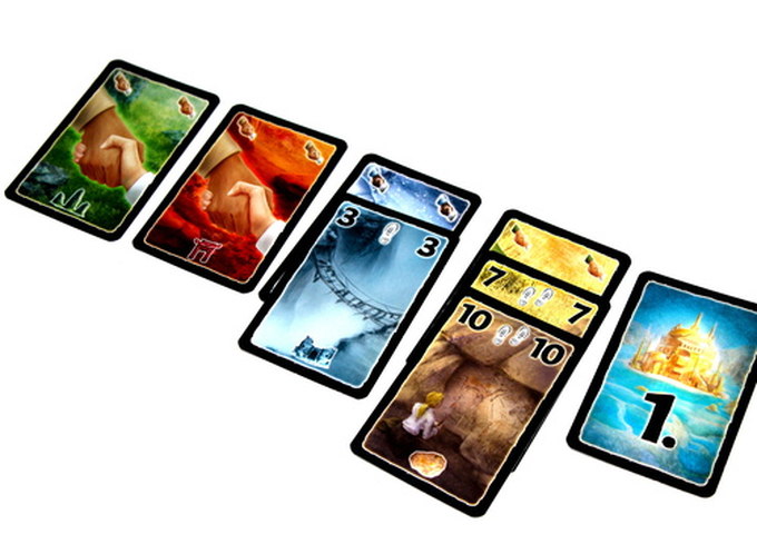 When the final card of a pile is revealed, divide all the coins in the center of the table equally among all players, then bring in a new pile to continue play. Once the final card of the final pile is revealed, the game ends immediately with no distribution of coins. For each expedition, a player scores the number of footprints on the numbered cards. If they have a wager in that color, they double that value; if two wagers, they triple it; etc. A player also scores 1 point for each gold coin they hold and 8 points for each expedition that contains at least four number cards. Whoever has the highest total wins!
