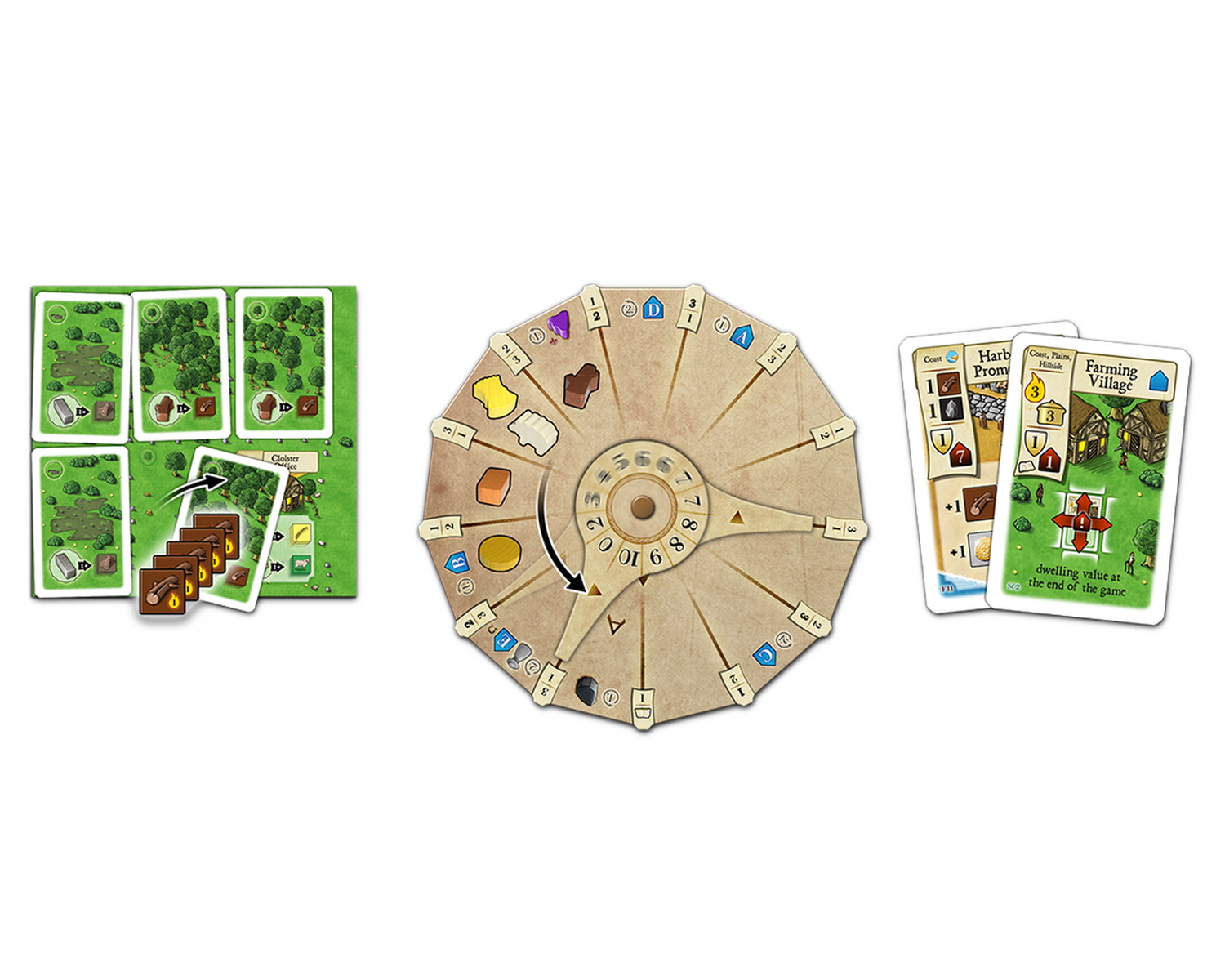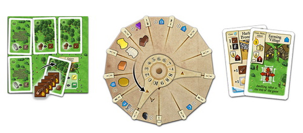 Each player has a personal game board. New buildings enter the game from time to time, and players can construct them on their game boards with the building materials they gather, with some terrain restrictions on what can be built where. Some spaces start with trees or moors on them, as in Agricola: Farmers of the Moor, so they hinder development until a player clears the land, but they provide resources when they are removed. Clever building on your personal game board will impact your final score, amd players can buy additional terrain during the game, if needed.