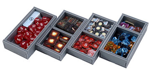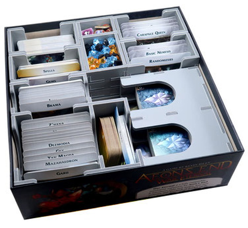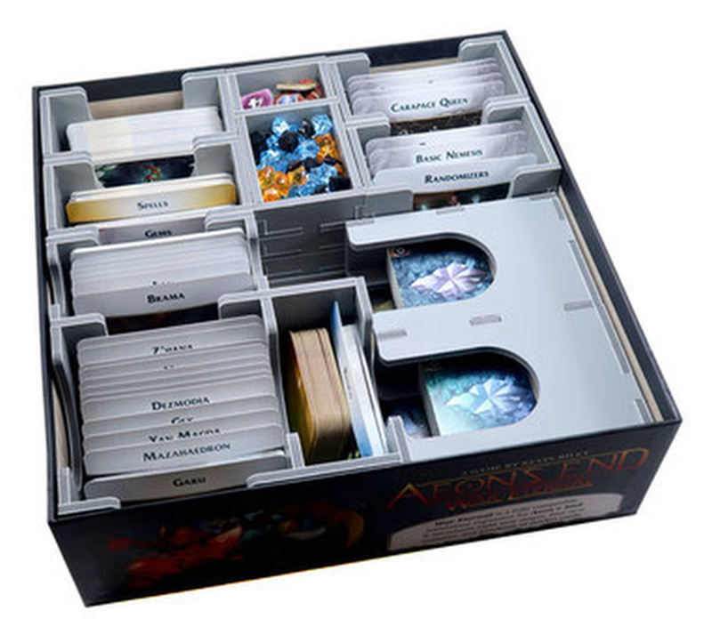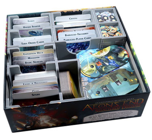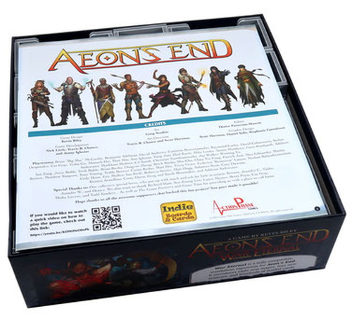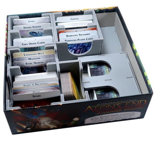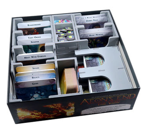 Insert compatible with Aeon's End®, and includes space for numerous expansions, storing 840 sleeved or 1,300 unsleeved cards. Insert is also compatible with the Aeon's End: War Eternal® and Aeon's End: The New Age® games. The design provides both efficient storage and improved game play. Many of the trays can be utilised during the game, and they greatly aid set-up and clear-away times. The rules act as a lid on top of the trays.