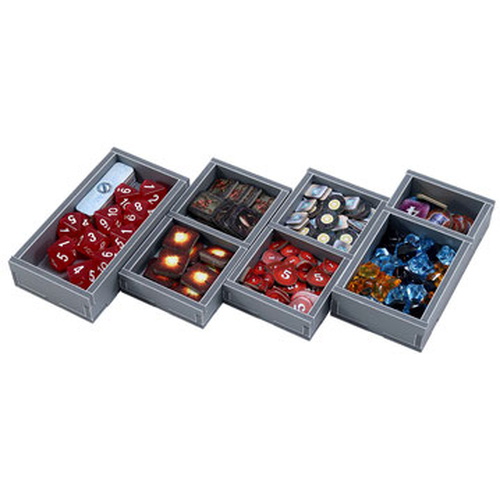 These are the four token trays that come with the insert. These can be used in different ways, depending upon your collection. The taller open tray on the left is best suited to the red dice and larger tokens. The other taller tray on the end with the divider is best for the plastic gems.