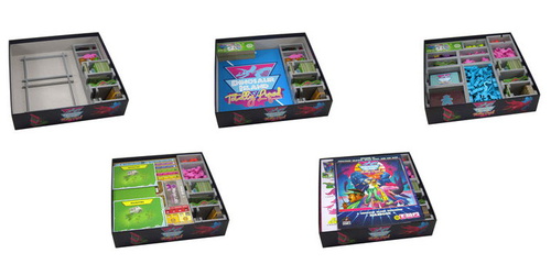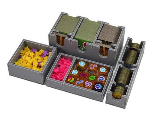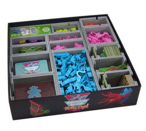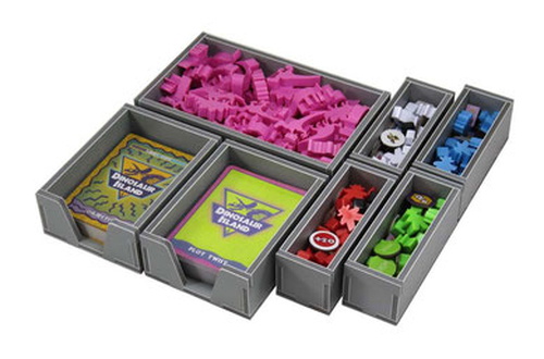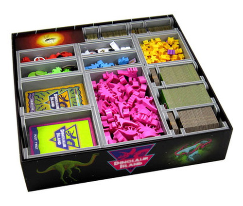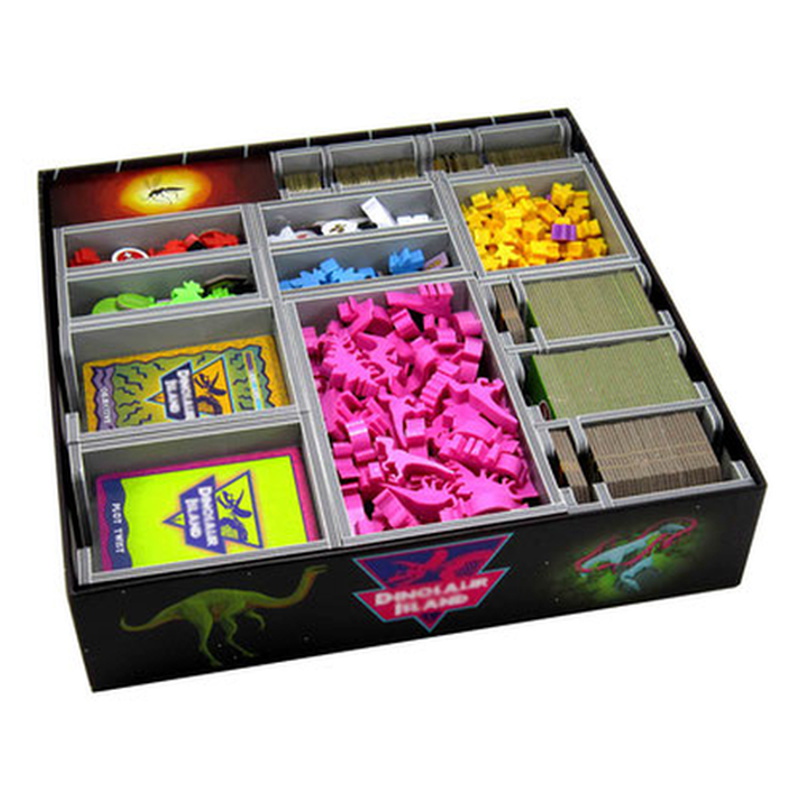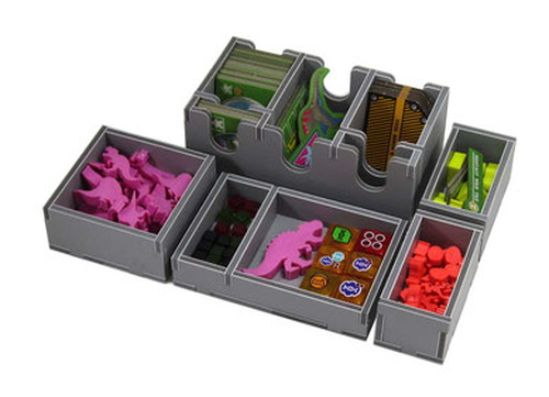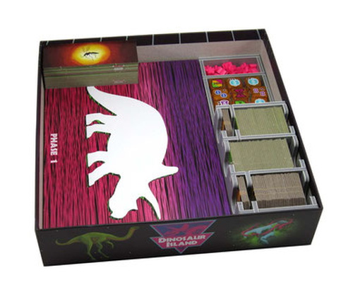 Insert compatible with Dinosaur Island Extreme Edition®. The design provides both efficient storage and improved game play. Many of the trays can be utilised during the game, and they greatly aid set-up and clear-away times. The rules and boards act as a lid on top of the trays.