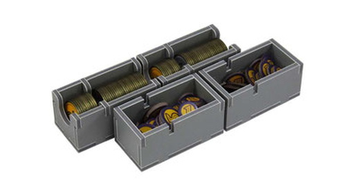The two coin trays can be assembled in one of two ways: either for vertical storage of the metal coins or as a simple box for storing the card coins from the game. Note that if the metal coins are used there is not then another storage space for the card ones, and these would need to be kept elsewhere.