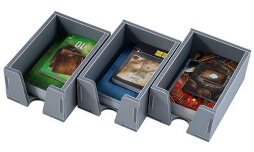 There are three trays for the game cards. The smaller game cards are placed on top of the larger cards as shown, and removed to add to the board when starting a game. There is space for all cards to be sleeved.