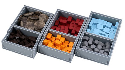 The first resource tray works equally well with either coin tokens or with the optional metal coins.