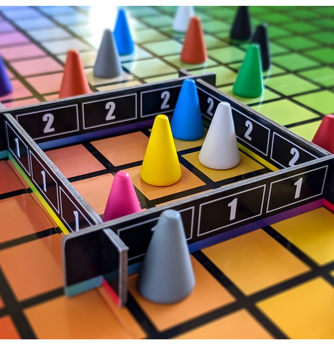 Gather around with three to ten people to play a quick and simple game with a prism of possibilities! First, a “cue giver” hides a specific color they’ve chosen out of a deck of cards. There are 480 shades on the board in front of you! After getting one- and two-word cues, everyone places their marker on which color they think is being described. “Coffee.” Is it dark brown, as in freshly brewed? “Au lait.” With milk. That means I should pick a lighter shade!