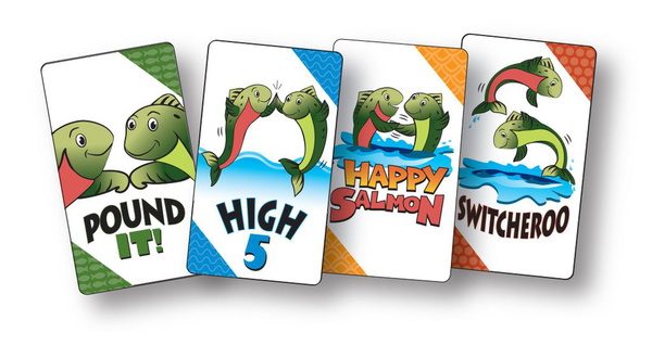 There are no turns. Players call out the action shown on their cards as fast as they can. When two players have a match, they celebrate by performing the action. Actions include the classic "High 5", the unifying "Pound It", the frantic "Switcheroo", and the delightful and bizarre "Happy Salmon".