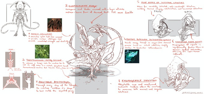 It sheds this outer skin during each development cycle, thanks to a violent thermochemical reaction. But that's not the worst part. You've heard about this research into weird crystals with a structure partially hidden in other dimensions? Well, our guys say these creatures employ a similar process. Much of their growth happens... elsewhere. Then, when they gather enough energy, they shift modified organs and body structures back into this world. The may also be native to deep space, as they survive vacuum well enough to put Tardigrades to shame. Anne also believes they’re an extremely adaptable omnivore. Sounds scary, right? I hope the top knows what they’re doing with this one.