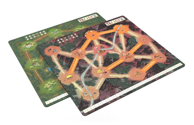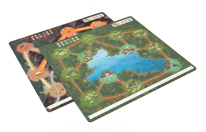 A deluxe double-sided neoprene playmat of the mountain and lake gameboards from Root: The Underworld Expansion.