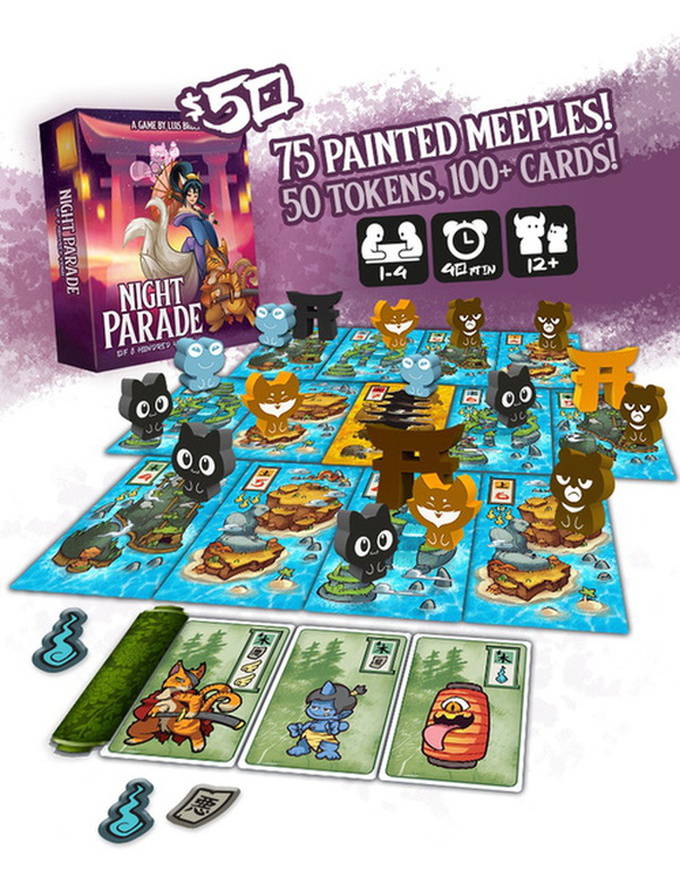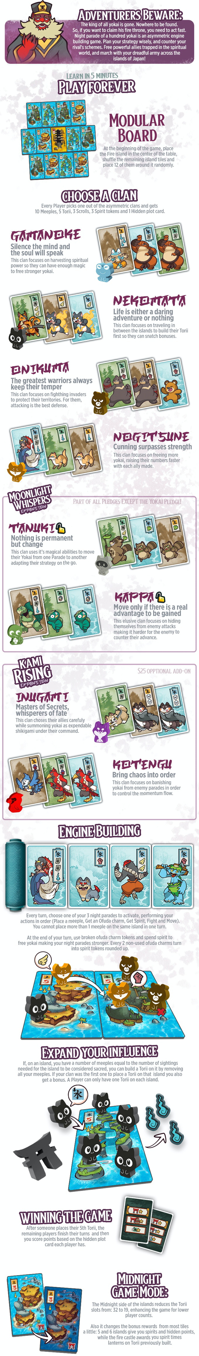 Pick from 4 asymmetric factions and draft to summon new yokai making the most efficient night parade. Every round, activate one of your parades to send meeples to haunt the islands, move around and fight each other. As soon as an island have a certain number of yokai, the denizens will build a shrine to pacify them, sending your meeples back to your player area. Once one player get 5 of their shrines in play, the remaining players get a last turn, then the game ends and victory points are scored based on hidden cards to decide the winner.