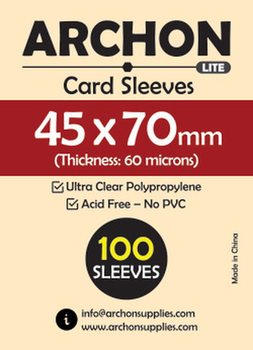 This is card protection sleeves from ARCHON LITE 45 X 70 MM. This pack contains 100 sleeves per pack and is designed to protect any card that is sized at 45 X 70 MM or smaller.