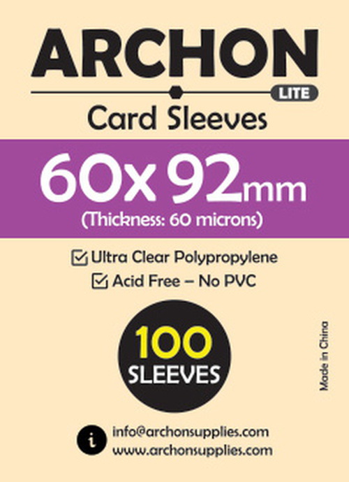 This is card protection sleeves from ARCHON LITE 60 X 92 MM. This pack contains 100 sleeves per pack and is designed to protect any card that is sized at 60 X 92 MM or smaller.
