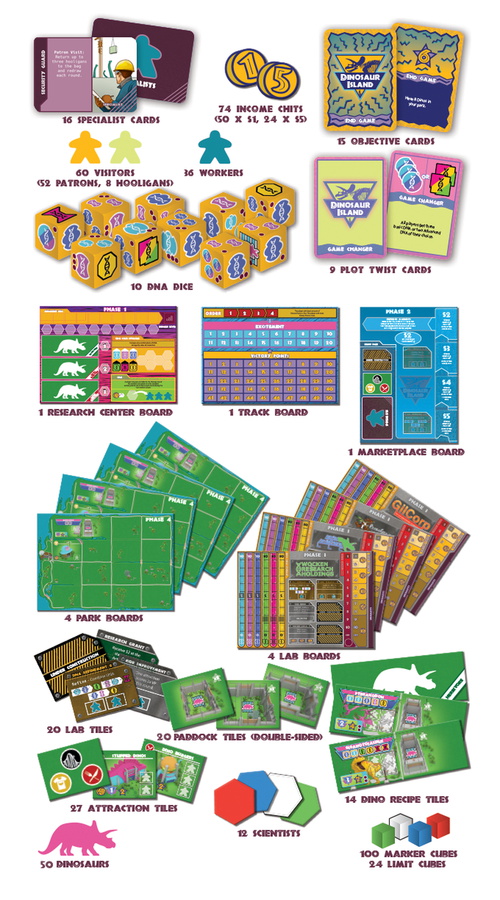 In Dinosaur Island, players will have to collect DNA, research the DNA sequences of extinct dinosaur species, and then combine the ancient DNA in the correct sequence to bring these prehistoric creatures back to life. Dino cooking! All players will compete to build the most thrilling park each season, and then work to attract (and keep alive!) the most visitors each season that the park opens.