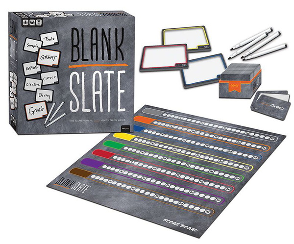 Each round in Blank Slate, pick one of the 250+ word cue cards (which have 500+ total cues) and reveal it. Each player then writes the word they think best completes the phrase, trying to exactly match another player's word without giving a single hint.