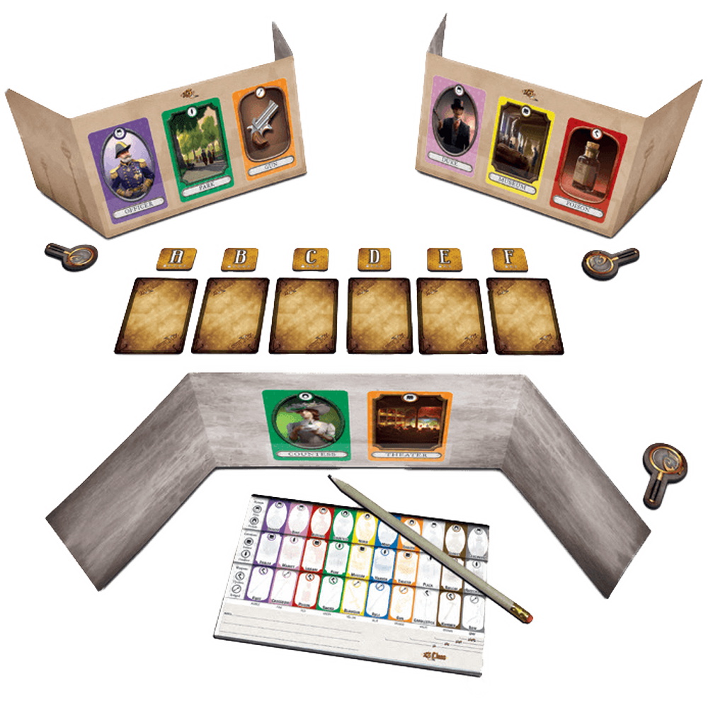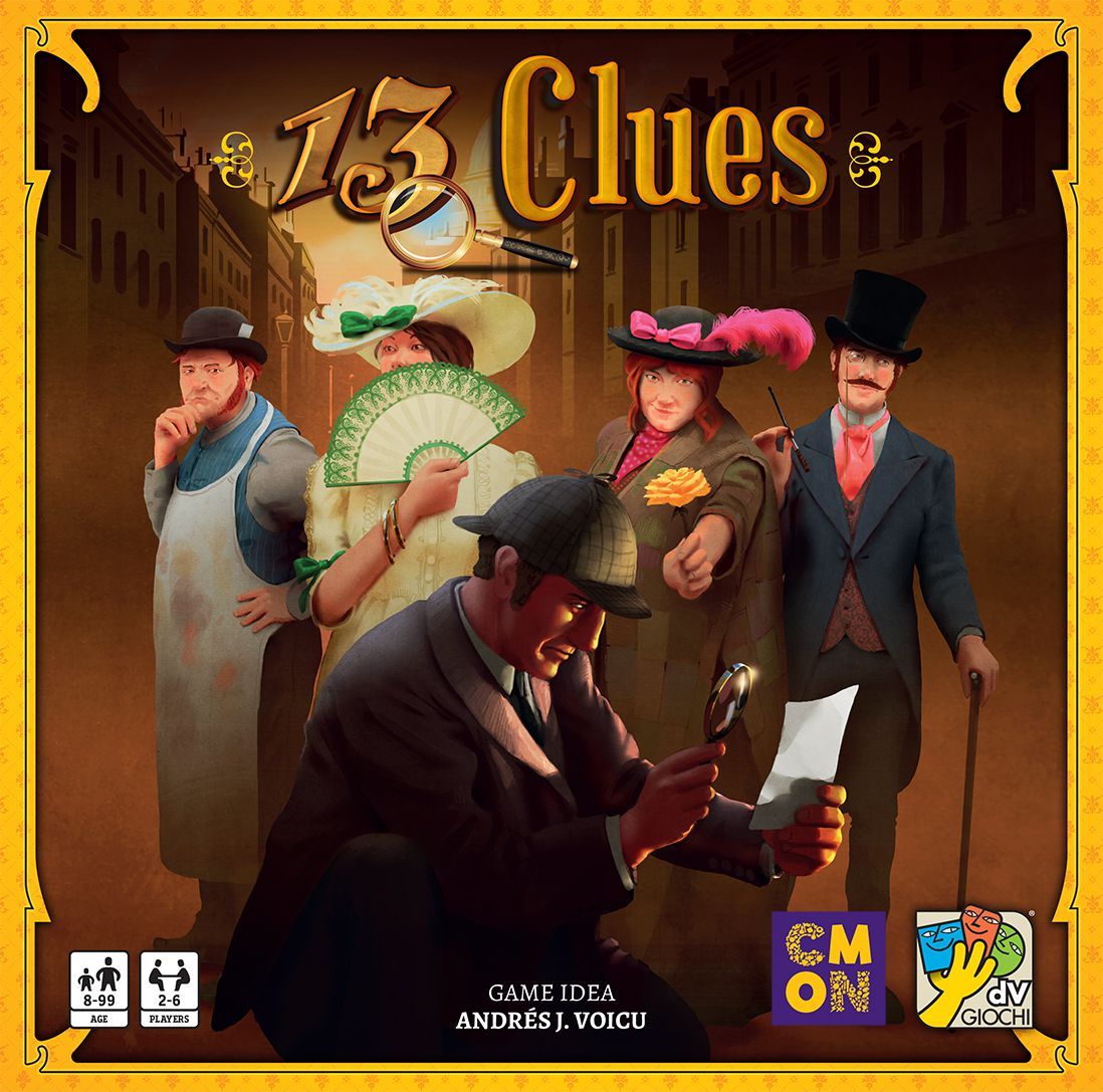 13 Clues, set at the end of the 19th century, puts players in the shoes of the detectives, each trying to solve their own mystery. Each player sees the clues — person + location + weapon — for the other players but not their own. They investigate by asking questions, by consulting the secret informant, and by making accusations in order to collect clues and rule out suspects. The goal of the game is to identify which of the 13 clues match their case before the others do!