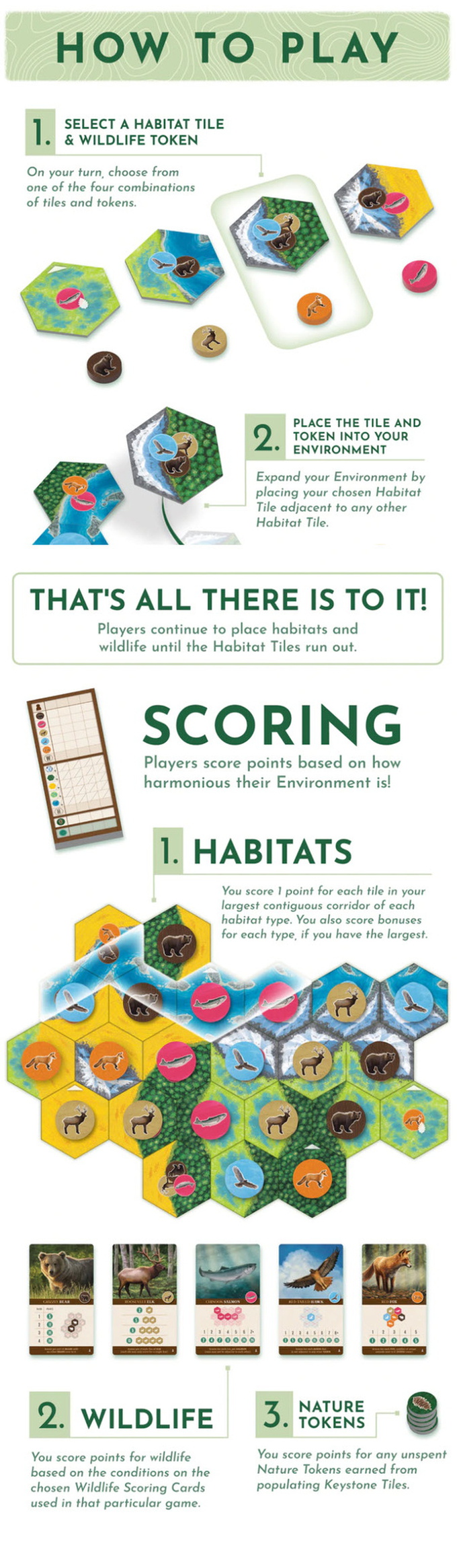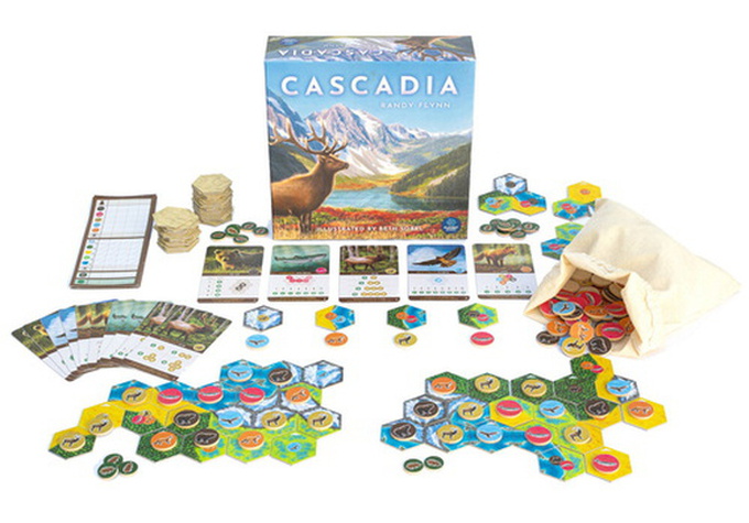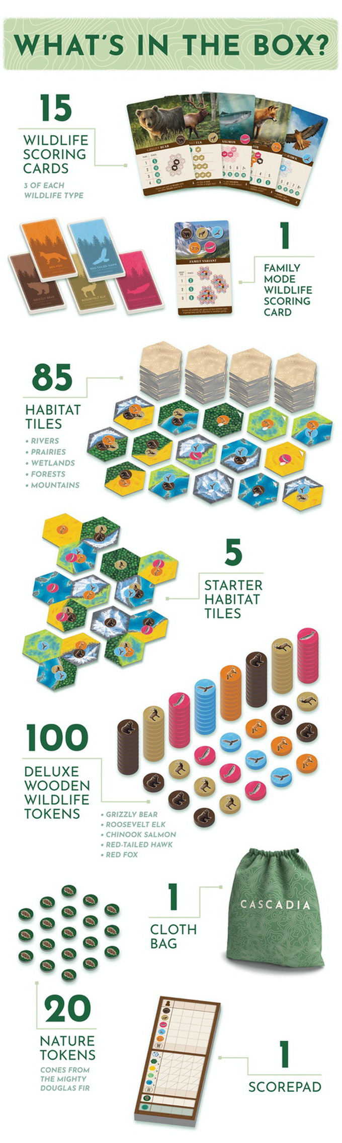 In Cascadia, players compete to create the most harmonious ecosystem by selecting and adding habitats and wildlife to their environment. The goal in placing habitat tiles is to create contiguous corridors by matching rivers, prairies, wetlands, forests, and mountains. Once habitats are placed, players populate them with the wildlife species that each habitat supports. Each species has their own spatial requirements and connections to one another and their ecosystem!