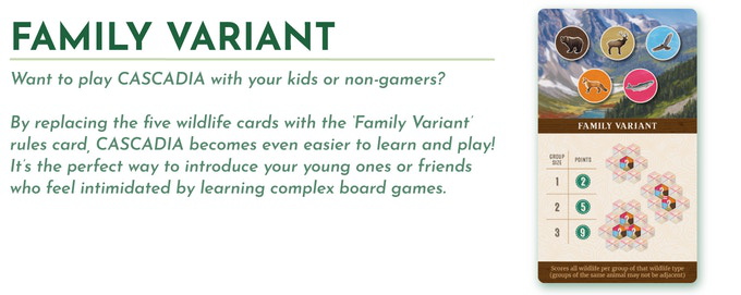 Cascadia also has a Family Variant! If you are playing with children, those new to gaming, or you just want to make the puzzle a little simpler, you can play with the included Family Variant Wildlife Scoring Card. This streamlines the wildlife scoring so that each animal scores in a similar way, reducing the number of different scoring conditions to learn, while still offering challenging puzzly gameplay. In addition to the Family Variant, the Wildlife Scoring Card features a flip side with an Intermediate Variant. This mode increases the challenge of the spatial puzzle a bit, without adding more complex scoring conditions.
