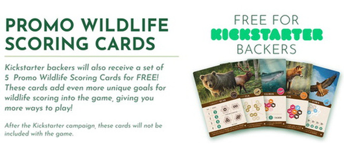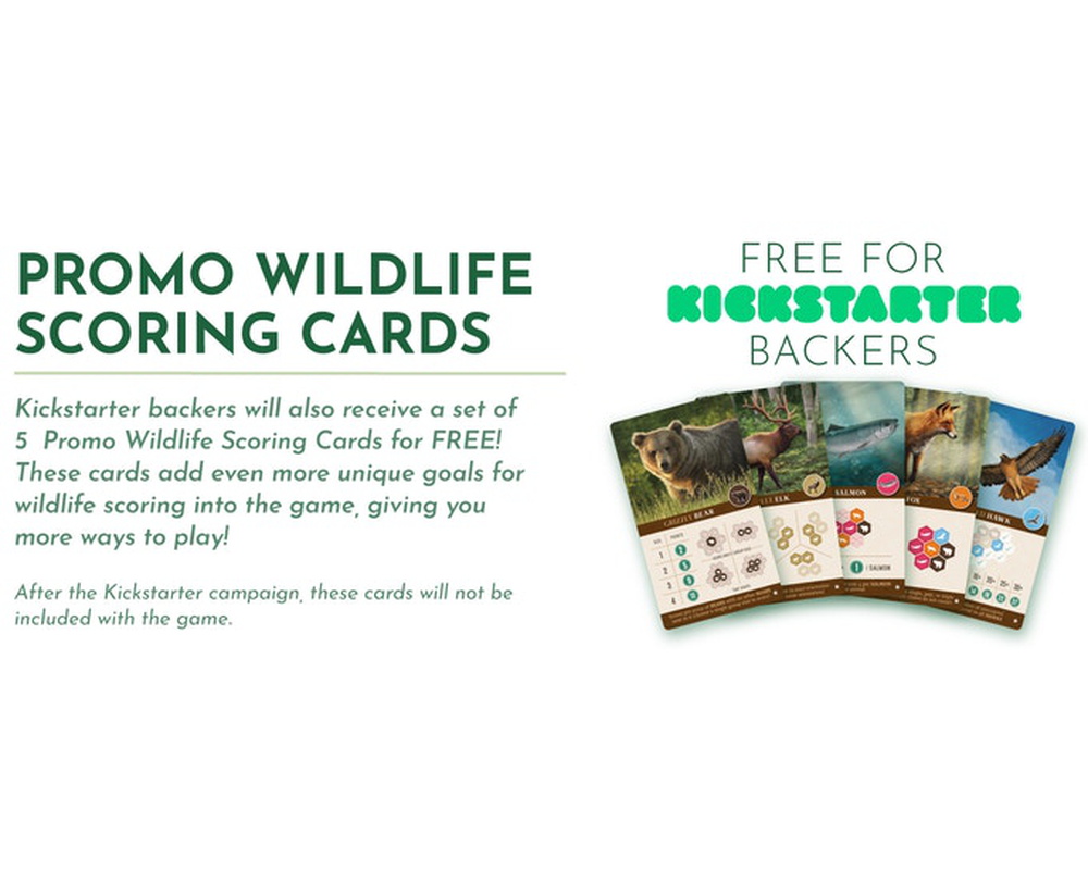 Kickstarter backers of Cascadia receive a set of 5 Tarot-sized Promo Wildlife Scoring Cards FREE! With the addition of these cards, players will be able to mix and match even more goals. These promo cards are a special THANK YOU to all backers for being early supporters, and will not be included with future copies of the game!