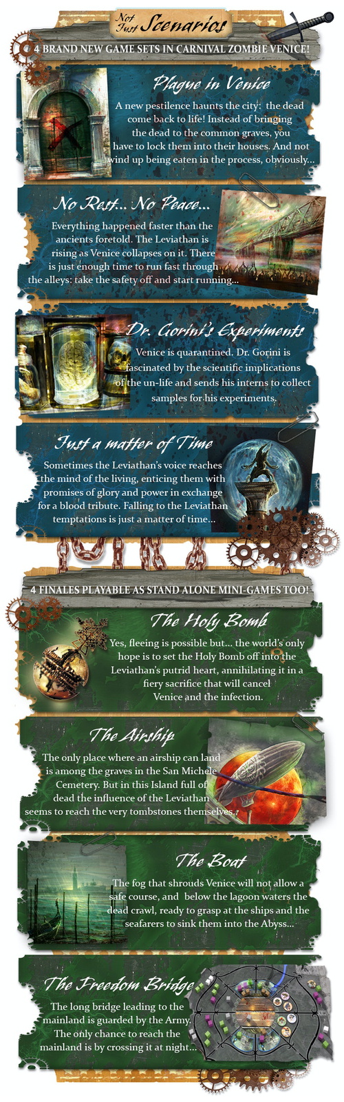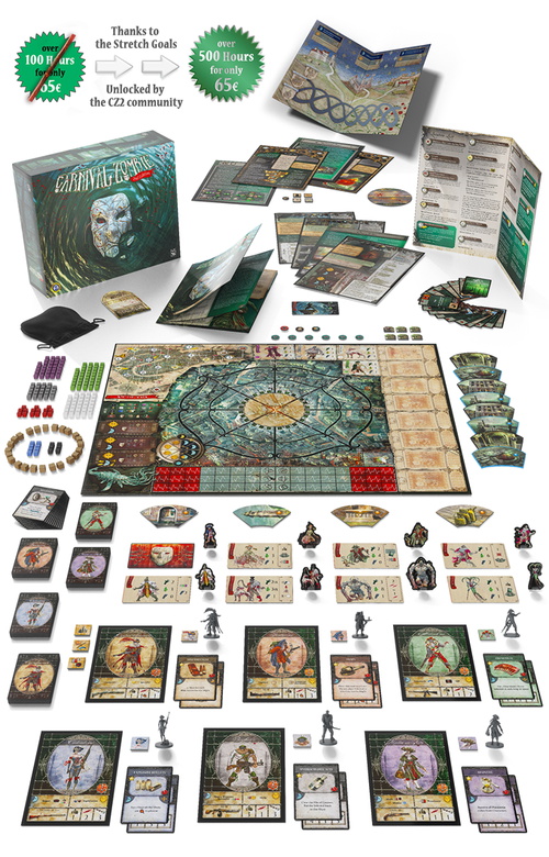 Carnival Zombie is a co-operative board game for 1 to 6 players, following a group of characters who are fleeing on terra firma from a sinking city overrun by zombies. Players control this party of heroes as they fight their way to one of the possible escape routes out of the city. During the night they face restless hordes of zombies, while during the day they recover, move, or search for useful items and survivors.